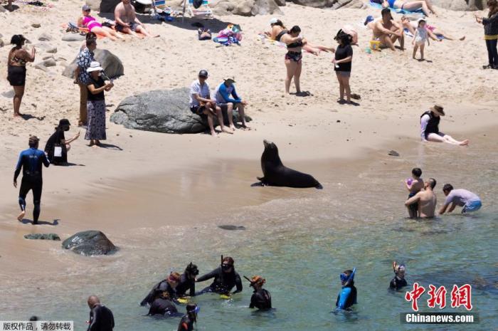 当地时间6月10日,在新冠肺炎疫情期间,美国加州旅游业开始复苏,大批游客前往海边享受阳光,巧的是,一头海狮也选择在这里晒太阳。