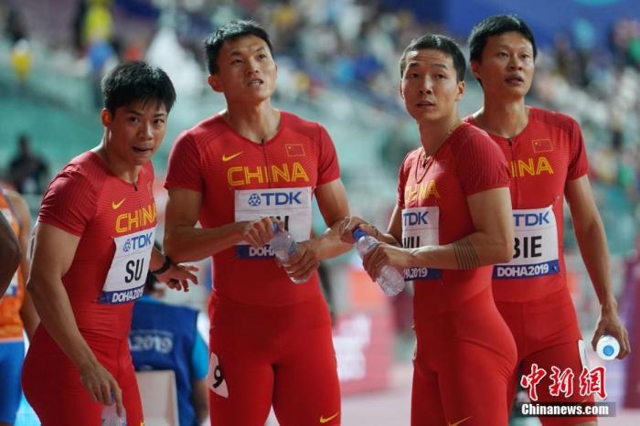 资料图:在卡塔尔多哈举行的2019国际田联世界田径锦标赛男子4X100米决赛中,由苏炳添、许周政、吴智强和别舸组成的中国队获得第六名,拿到东京奥运会入场券。图为中国队选手苏炳添(左一)、许周政(左二)、吴智强(右二)和别舸(右一)在比赛后查看成绩。 中新社记者 泱波 摄