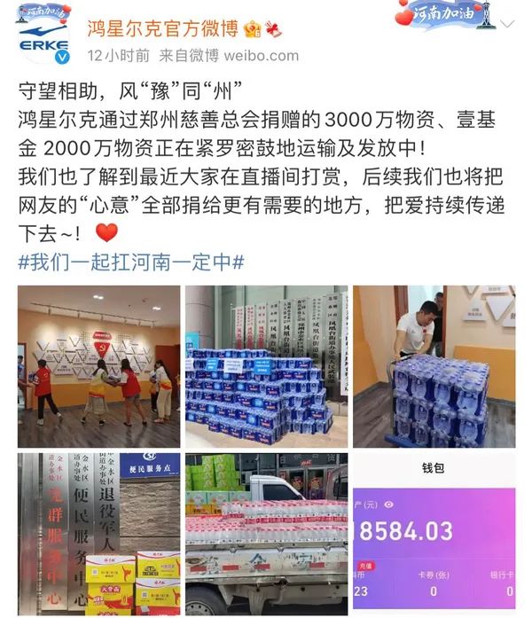 鸿星尔克发布的微博。 25日,鸿星尔克相关人士亦向中新网表示,公司目前暂不对外接受采访,先专注于把救灾物质工作做好。公司不想因为捐赠过多的占用媒体资源宣传,后续会有专门部门对接媒体。 鸿星尔克火起来源于其21日发布的一条捐赠微博:通过郑州慈善总会、壹基金紧急捐赠5000万元物资,驰援河南灾区。 随后,“鸿星尔克2020年巨亏,却花了5000万元驰援灾区”消息在网络上不断发酵,网友纷纷留言,“感觉你都要倒闭了还捐了这么多”“怎么宣传下啊宝,我都替你着急”“大家帮鸿星尔克上上热搜”。 自此,鸿星尔克开始了刷屏的节奏,“鸿星尔克的微博评论好心酸”“鸿星尔克的会员被充到了2140年”“鸿星尔克立志成为百年品牌”“男子在鸿星尔克买500付1000拔腿就跑”……等话题不断霸榜热搜前五。 为了支持鸿星尔克,鸿星尔克直播间涌入大批购买者。如,曾经观看人数不足1万的淘宝直播间,22日观看人次直接突破200万,上架一款抢空一款。目前该直播间已飙升至1000多万粉丝。25日凌晨1时左右,直播间在线观看人数仍超1900万。 中新网记者注意到,京东天猫抖音等平台上的鸿星尔克官方旗舰店部分商品已显示“售罄”或“无货”或“已抢光”。7月24日,在鸿星尔克抖音直播间里,由于没有库存,工作人员“被迫”弹吉他卖艺,网友却不断要求,“上包装盒”“上标签”“上鞋底,鞋帮我自己缝”“这款没货,给个吊牌我自己缝”。