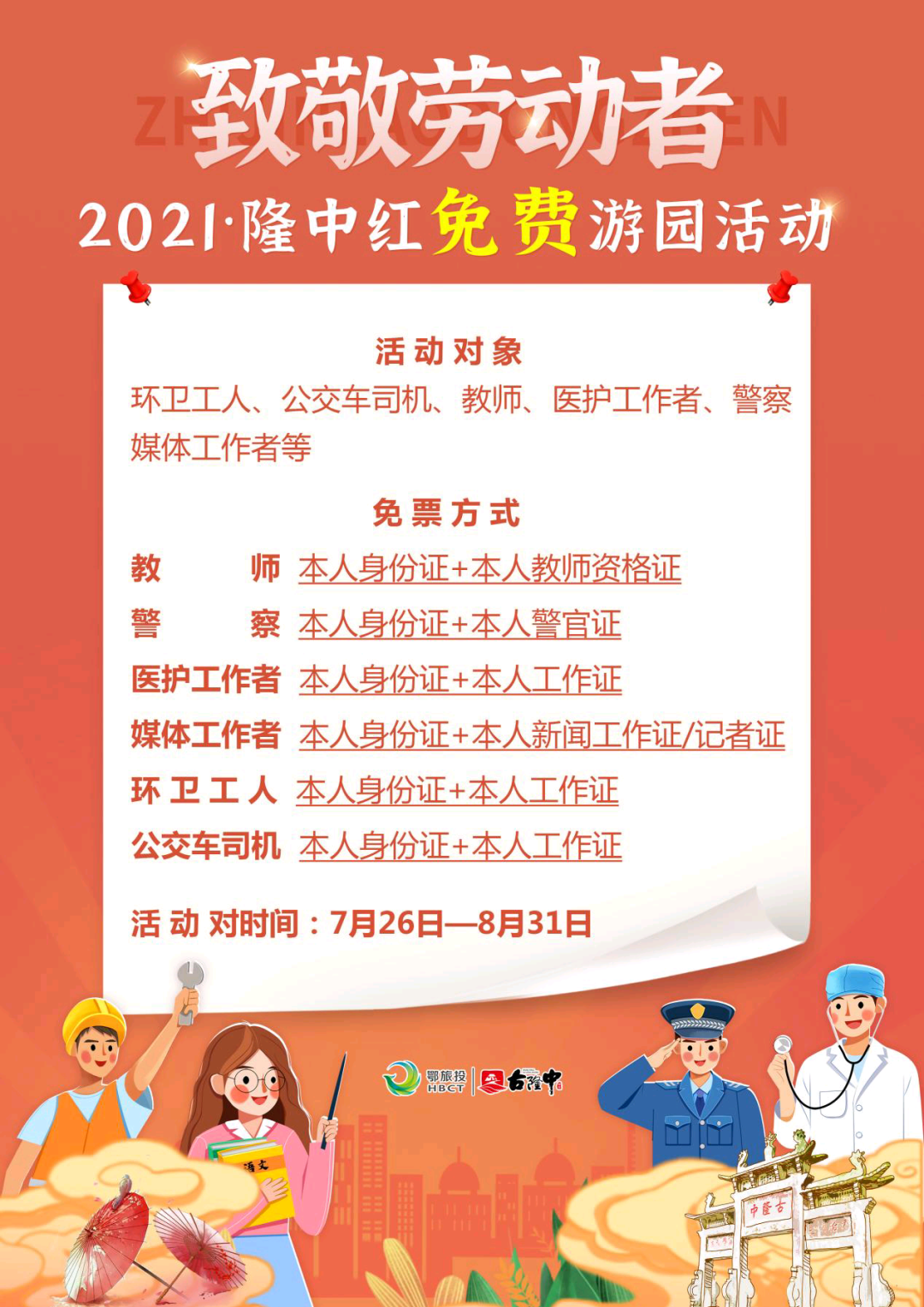 据介绍,此次一线劳动者可免费畅游古隆中活动将持续到8月31日,活动人群覆盖城市一线劳动者,包括环卫工人、公交车司机、医护工作者、现役军人、教师、警察及记者,以上人群凭本人身份证及相应职业工作证,即可免票入园。