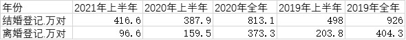 根据记者梳理,去年上半年离婚人数是159.5万对,不过去年上半年受疫情因素影响,数据不具有可比性。因此以2020年全年数量的一半来计算,或者采用2019年上半年的数据,更具有可比性。