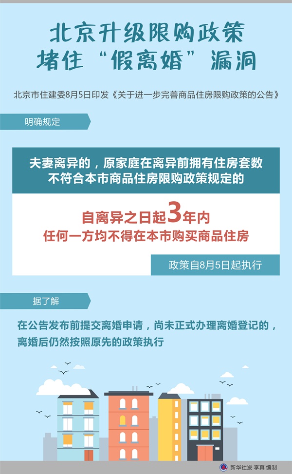 新华社北京8月5日电(记者郭宇靖)北京市住建委8月5日印发《关于进一步完善商品住房限购政策的公告》,明确规定夫妻离异的,原家庭在离异前拥有住房套数不符合本市商品住房限购政策规定的,自离异之日起3年内,任何一方均不得在本市购买商品住房。政策自8月5日起执行。