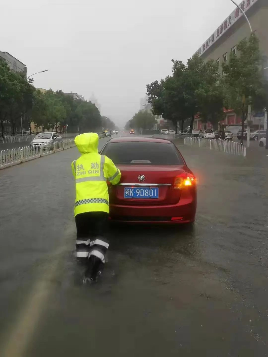中午时分,大雨还在持续下着。孝感交警直属一大队执勤人员在学院路巡逻时遇到被水围困的市民,立即上前帮扶市民度过积水路段。
