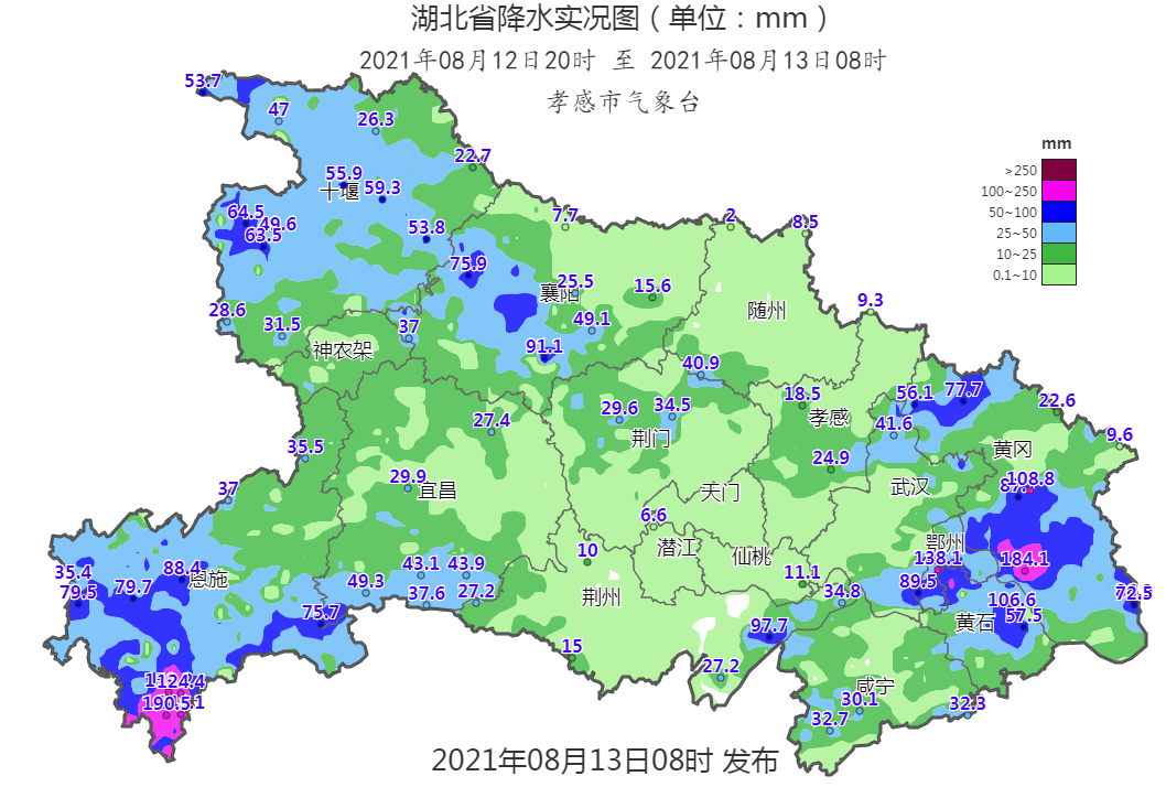 据国家站雨量监测显示(2021年08月12日20时-08月13日08时)有:6站大雨、45站中雨、其他站小雨。雨量较大的有:三汊37、杨店35、祝站29、孝感27、卧龙24、西河24、孝感城区24、毛陈23、河口36、河口花园30毫米。小时雨强较大的有:16毫米(三汊,13日07时)、15毫米(毛孙,12日05时)、14毫米(河口花园,13日05时)。
