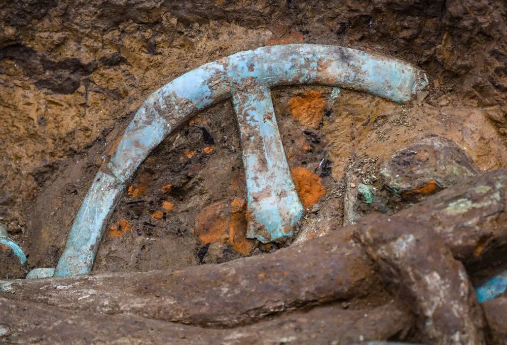 ↑这是在四川德阳广汉市三星堆考古发掘现场8号“祭祀坑”拍摄的青铜太阳形器局部(9月2日摄)。