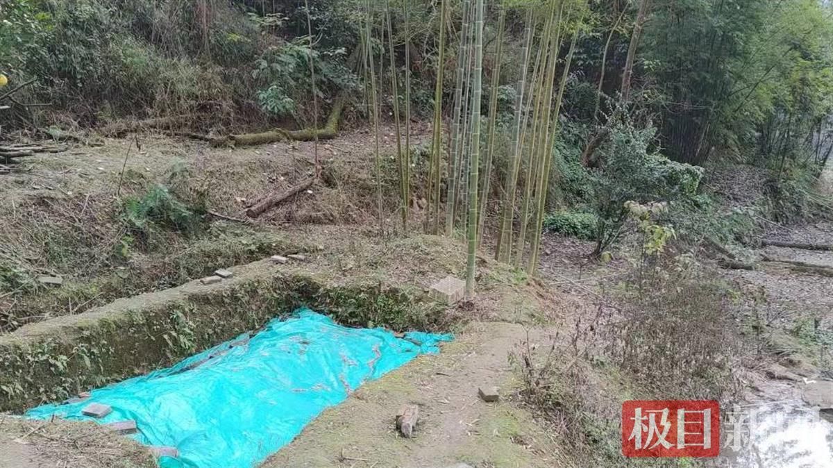 30日下午,在村民黄师傅的带领下,极目新闻记者来到了李景伟四岁前生活过的地方,如他手绘的地图一样,梯田、水塘、竹林这些场景没有什么变化,但他家原来的老屋已不复存在,只留下一块覆盖着塑料膜的屋基,显得一片颓败。村民黄师傅告诉极目新闻记者,李景伟家的房屋原先是瓦房,后来年久失修倒塌了,成了现在这个样子。
