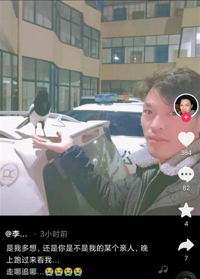 30日晚上7时左右,李景伟更新了一条抖音,一只黑白相间的鸟儿停留在他的车上久久不愿离去,他写道:“是我多想,还是你是我的某个亲人,晚上跑来看我……”
