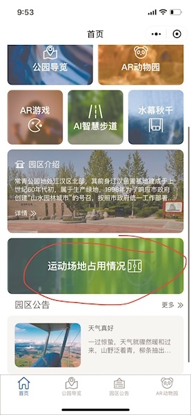 同时,小程序里加载了公园电子导览地图、AR动物园、AR游戏体验区域、AI智慧步道数据、水幕秋千等特色娱乐项目,像火热的网球场、足球场、羽毛球场等运动场地的占用情况,手机上也一目了然。