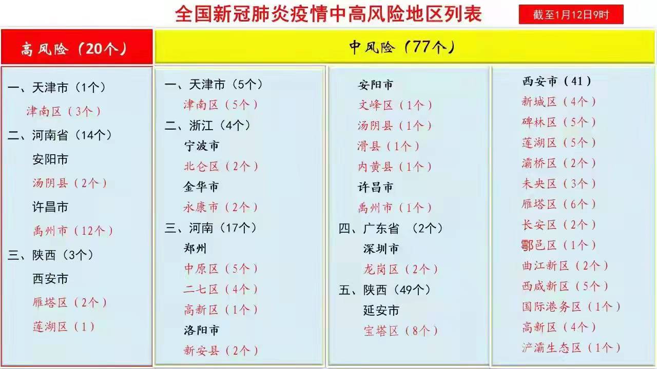 最新!全国新冠肺炎疫情中高风险地区公布!(截至1月12日9时)