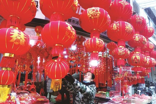 ▲1月21日,孝感城区汤家街商户挂满了大红灯笼。春节临近,节庆商品俏销,市民开始挂灯笼、贴纸花、贴对联,迎接虎年春节。