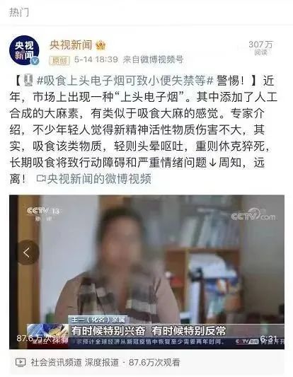 “上头电子烟”是添加大麻等违禁成分的电子烟,“上头电子烟“外观虽与普通电子烟相似,但烟油中添加有“合成大麻素”,实质是新型毒品。吸食后会在不知不觉中染上毒瘾,过量吸食则会出现昏迷、休克、窒息、猝死等情况,危害性极大。