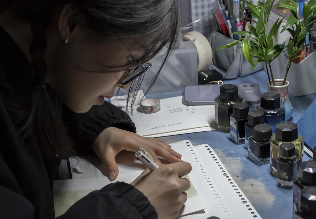 看到菊花体博主在朋友圈晒客单后,刘凯悦也心动了,“万一真的有人愿意赏识我呢?”抱着这样的想法,她也尝试发布接单信息。让她出乎意料的是,一些校内的小伙伴很快通过朋友圈找到她“约字”,零零散散的单子加起来接近30单。她用收入所得买了新的彩墨和明信片,还给妈妈发了小红包,分享自己的快乐,“自己的爱好能获得大家的认可就是一件超级幸福的事!”