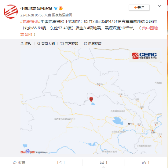 青海海西州德令哈市发生3.4级地震,震源深度10千米