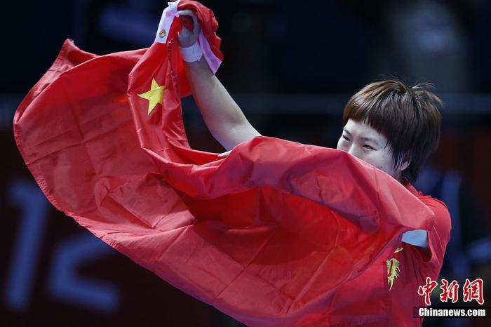 资料图:伦敦奥运会乒乓球女子单打决赛中,中国选手李晓霞战胜队友丁宁,夺得金牌。记者 盛佳鹏 摄