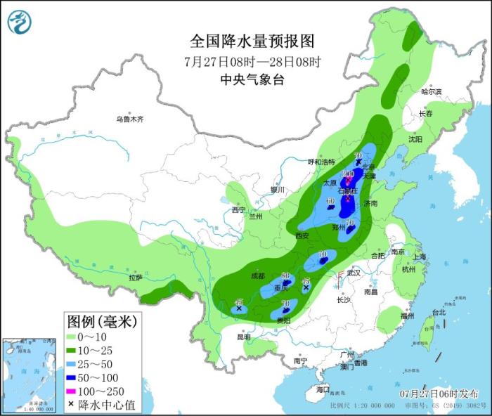 7月27日08时至28日08时,内蒙古东部、西北地区东部、华北、黄淮西部、江汉中西部、西南地区东部等地的部分地区有中到大雨,其中,河北中南部、河南北部和东部、湖北西部等地部分地区有暴雨,局地大暴雨(100~200毫米)。内蒙古东部等地的部分地区有4~5级风(见图2)。