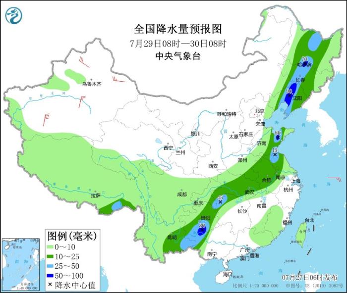 7月28日08时至29日08时,内蒙古东南部、东北地区西部和南部、华北东部、黄淮东部、江汉大部、湖南北部和西部、西南地区东南部等地部分地区有中到大雨,其中,辽宁中西部、山东中部、湖南北部、贵州中部等地部分地区有暴雨,局地大暴雨(100~110毫米)(见图3)。