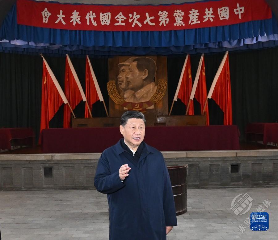 10月27日,中共中央总书记、国家主席、中央军委主席习近平带领中共中央政治局常委李强、赵乐际、王沪宁、蔡奇、丁薛祥、李希,瞻仰延安革命纪念地。这是习近平在杨家岭瞻仰中共七大会址。 新华社记者 燕雁 摄
