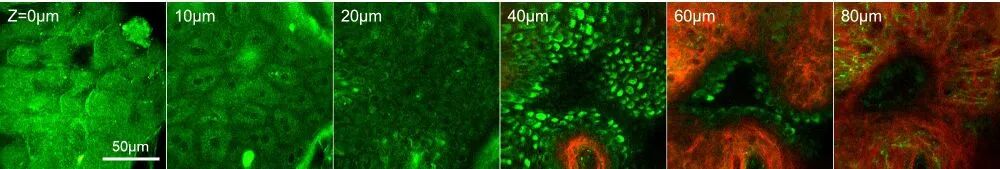 据悉,空间站双光子显微镜能以亚微米级分辨率清晰呈现出航天员皮肤结构及细胞的三维分布,具备对皮肤表层进行结构、组分等无创显微成像的能力。成像结果显示,皮肤的角质层、颗粒层、棘层、基底细胞层、真皮浅层等三维结构清晰可辨。