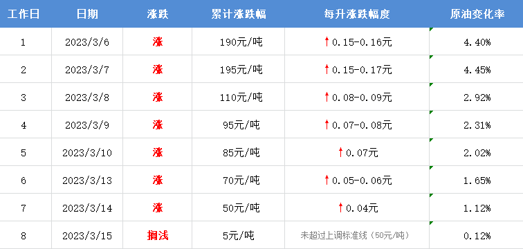 3月15日,本轮油价计价统计周期第8个工作日,参考原油变化率为0.12%,预计汽柴油累计上调5元/吨,未超上涨红线(50元/吨),暂处于搁浅区间。