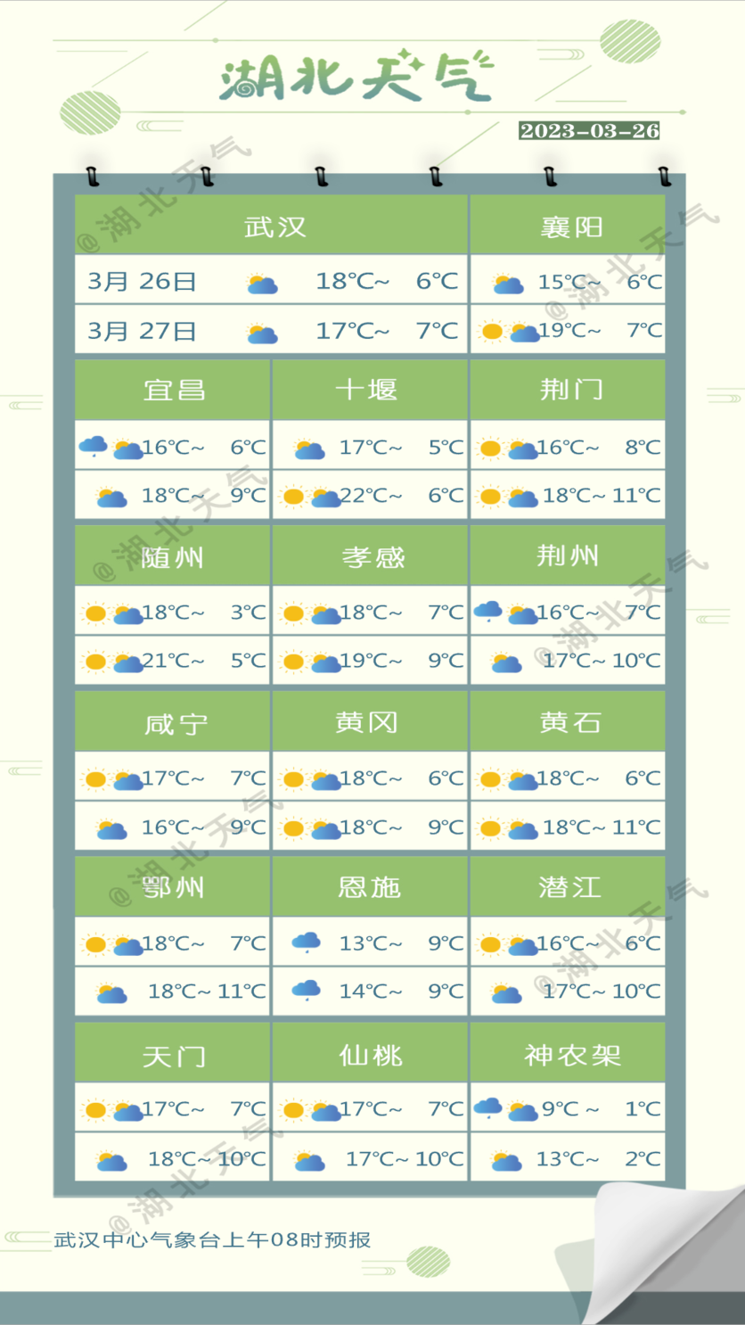 鄂西南、江汉平原南部、鄂东南南部阴天有小雨;其他地区多云。