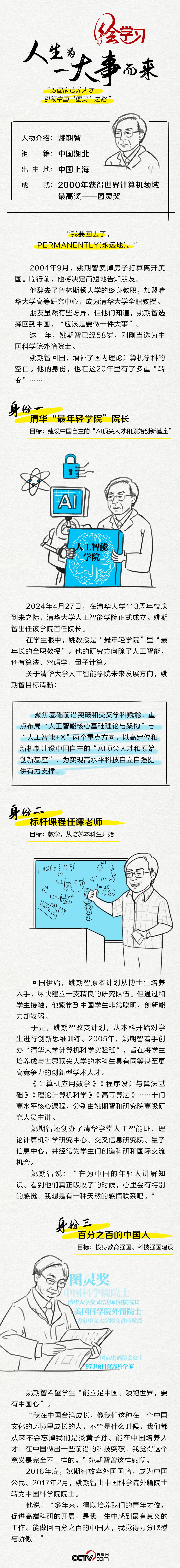 作为一名计算机科学专家,姚期智是图灵奖创立以来首位亚裔获奖者,也是世界现代密码学基础的奠基人之一。2004年,姚期智辞去美国普林斯顿大学终身教职,回国到清华大学全职任教。他曾说,“人生为一大事而来”。这件大事,就是“为国家培养人才,引领中国‘图灵’之路”。央视网《天天学习》栏目推出手绘长图,为您讲述姚期智将爱国之情化为报国之行的奋斗故事。