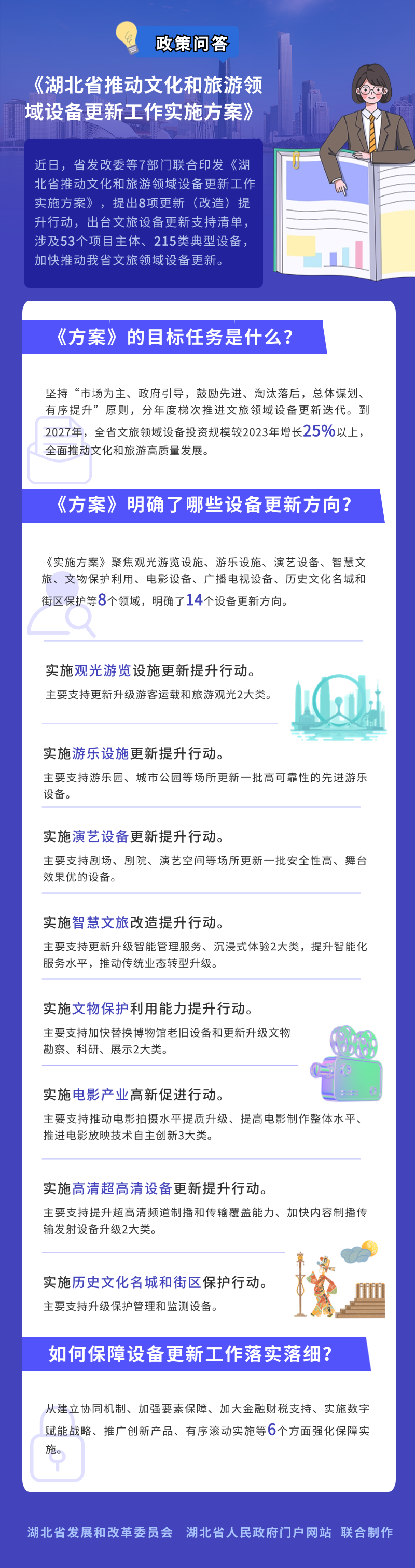 为全面提升湖北文旅领域设备更新,推动文化和旅游产业高质量发展,近日,省发改委等7部门联合印发《湖北省推动文化和旅游领域设备更新工作实施方案》,一起来了解。