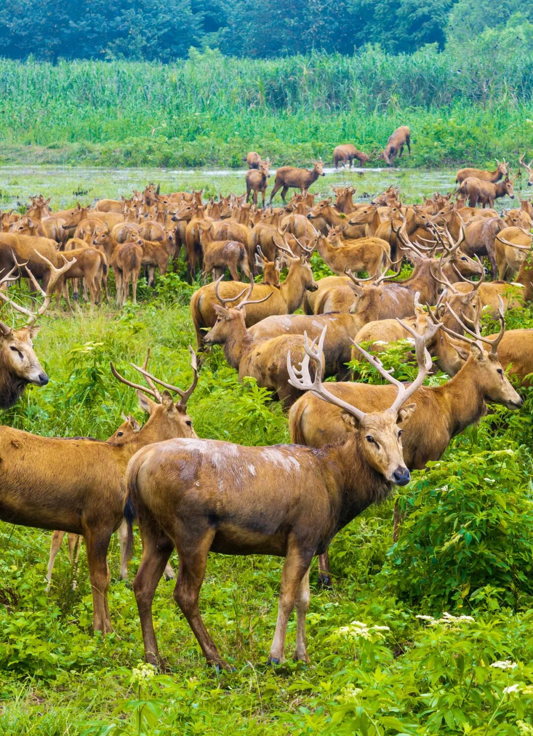 石首天鹅洲位于长江故道边,水草丰茂、湿地广阔,历史上就是麋鹿原生地。《墨子》曾记载“荆有云梦,犀兕麋鹿满之”。