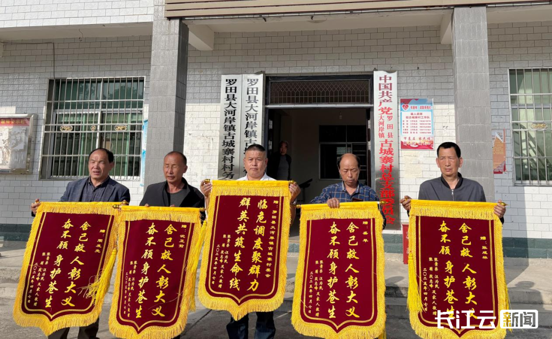 4月8日,被救者张先生带着家人来到大河岸镇古城寨村党员群众服务中心,向4月5日参与救援的群众送上锦旗,感谢他们的救命之恩。