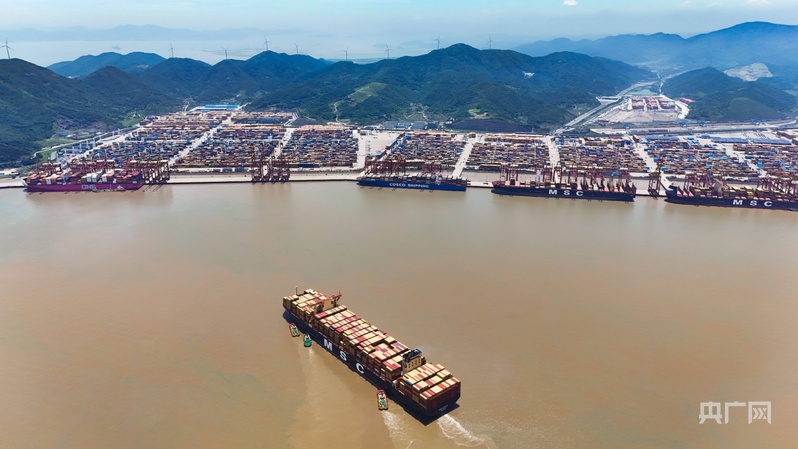 满载货物的“地中海洛雷托”号正缓缓靠泊宁波舟山港(央广网记者 尚天宇 摄)