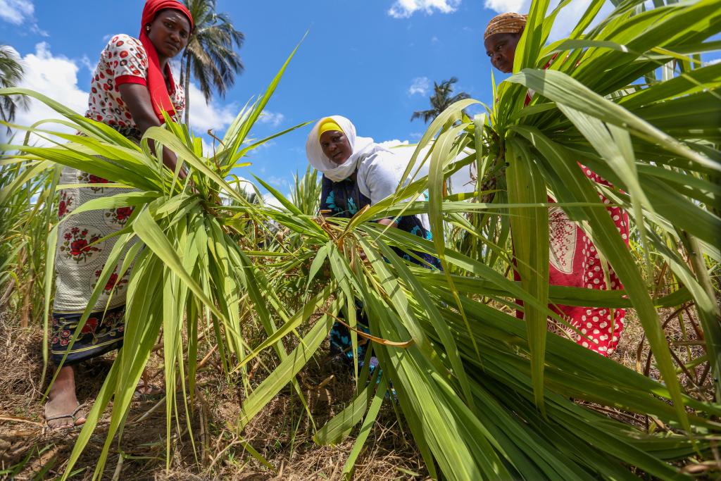 9月20日,在坦桑尼亚桑给巴尔,塔希娅·包索·马萨韦(中)与同伴采收菌草。(埃马纽埃尔·赫尔曼 摄)