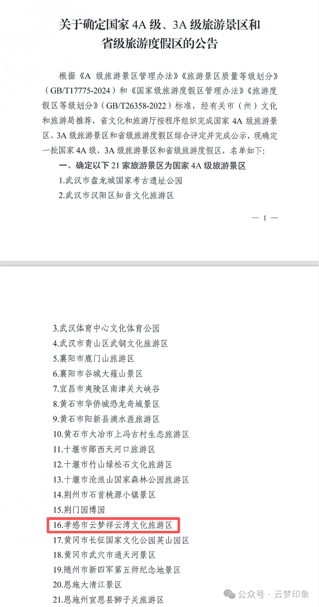 12月19日,湖北省文化和旅游厅发布《关于确定国家4A级、3A级旅游景区和省级旅游度假区的公告》,其中,孝感市云梦祥云湾文化旅游区被评定为国家AAAA级旅游景区。