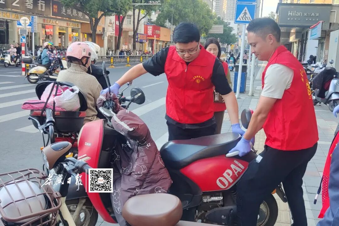 志愿者在孝感城区文化路航天社区段将电动车摆放整齐。全媒体记者吴垠 通讯员丁云香 摄