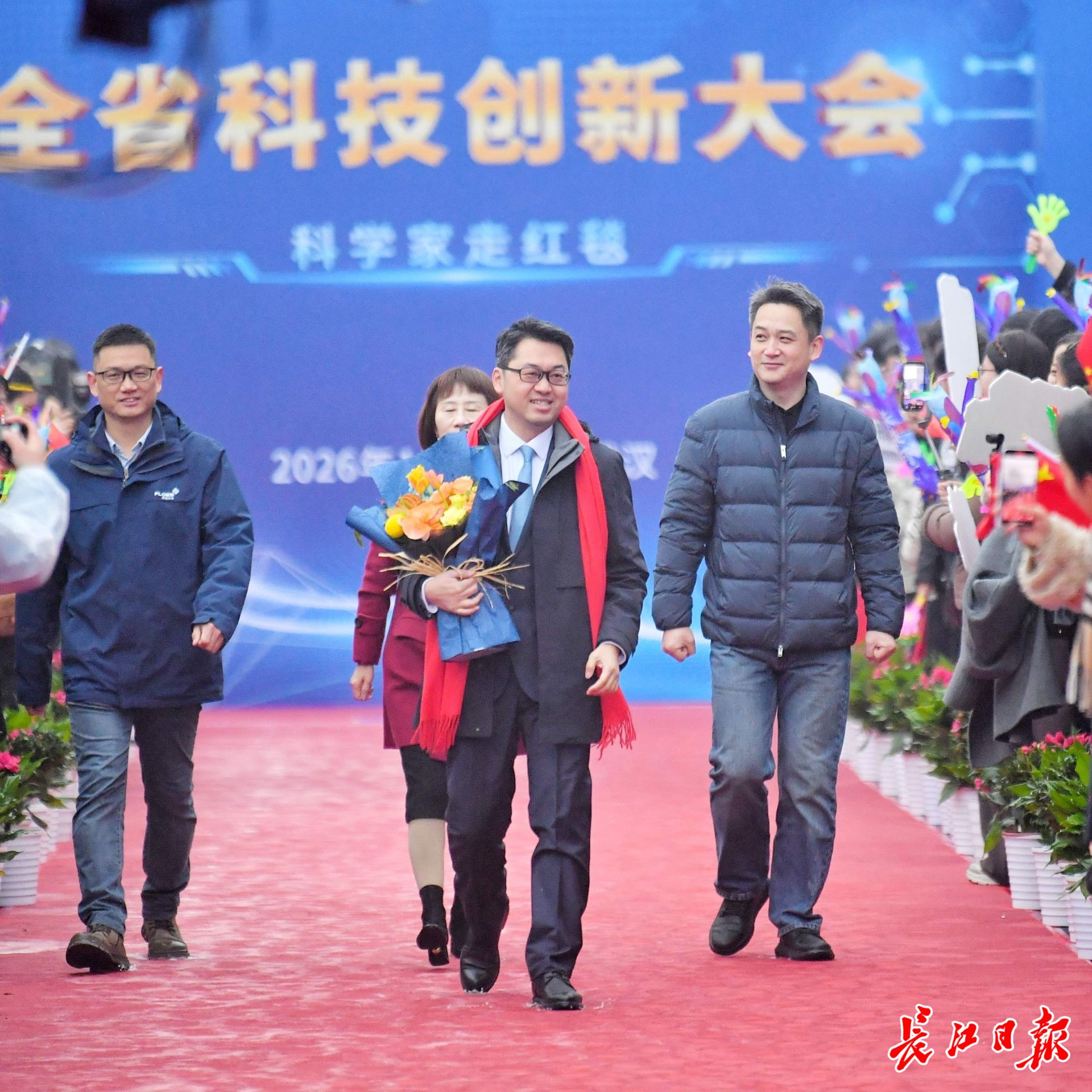 华中农业大学教授,2025年度湖北省青年科学创新奖获得者高泽霞(持花束者)走上红毯。