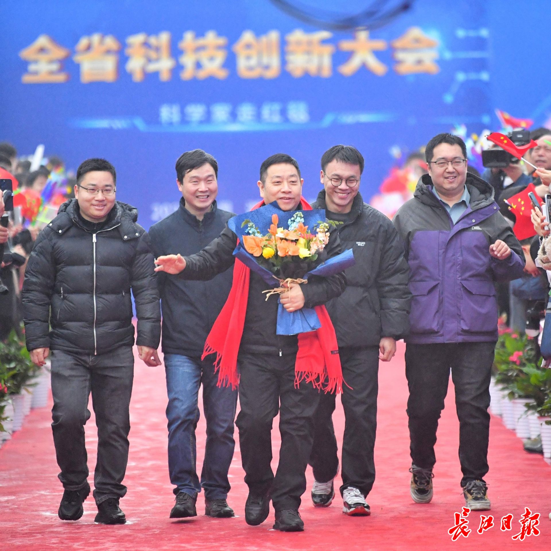 长江日报大武汉客户端1月4日讯 1月4日,湖北省科技创新大会在武汉举行。举办大会的洪山礼堂外,一条百米红毯铺就星光大道,在鲜花簇拥中,12位“科学之星”款步而来。这已是湖北省科技厅“科学家走红毯活动”第七年绽放荆楚,见证着湖北科技创新的蓬勃脉动。