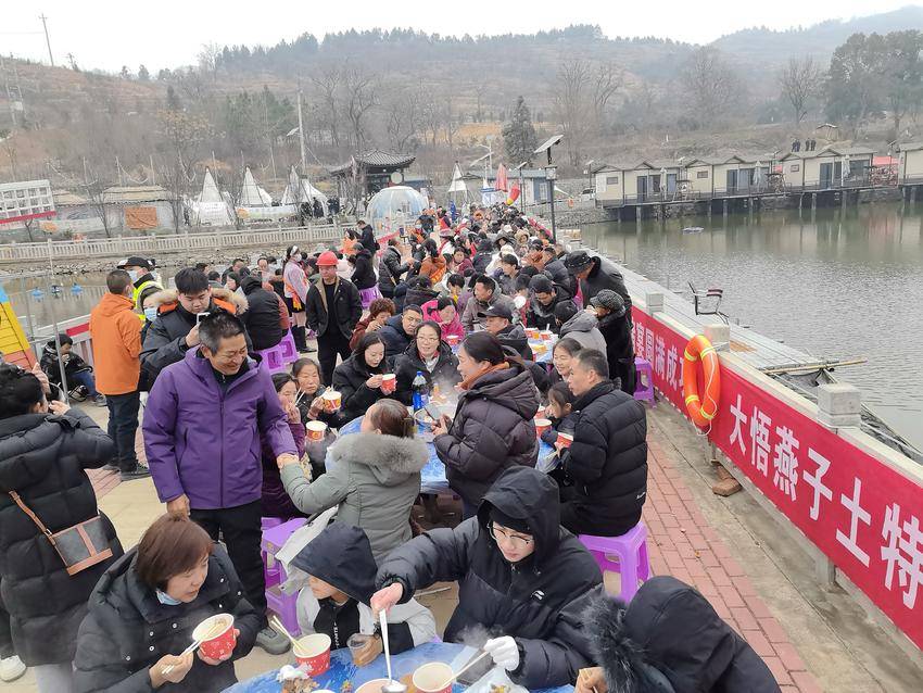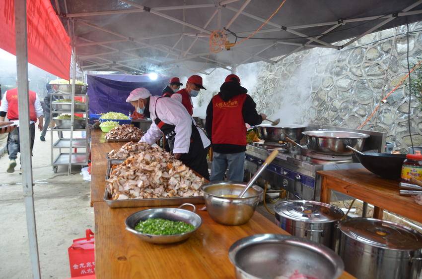 上午11点,杀猪宴正式开席。游客凭券分批有序入座,每轮接待1000余人,千人同席品佳肴、话年俗的壮观场景,尽显乡土烟火气息。席间,采莲船、舞狮等非遗表演轮番上阵,演员们载歌载舞,将欢乐氛围推向高潮;游客们一边品尝萝卜炖肉、炖粉条等大悟特色农家菜,一边沉浸式感受传统民俗魅力,在欢声笑语中体会老区人民的豪爽与热忱。活动中,自媒体会员与200余名志愿者主动担当、贴心服务,按照分工有序开展路线引导、答疑解惑、就餐协助等工作,用暖心举动为游客保驾护航。大悟稻鸭香米、云锦宴会中心等30余家爱心企业及个人积极响应,主动捐赠食材、餐具等物资,以实际行动为这场年味盛宴添砖加瓦。