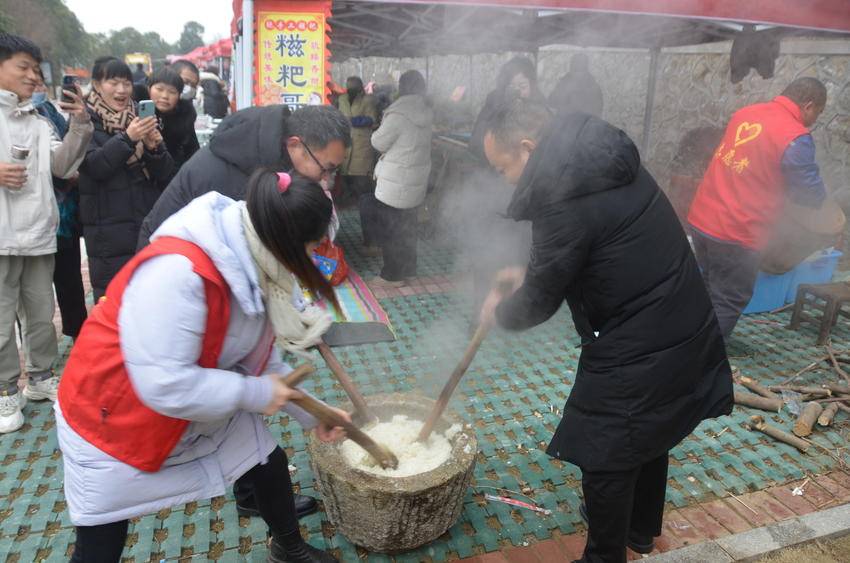 与其他地方的杀猪宴不同,孔雀山庄这场免费的杀猪宴,坚持以文化传承为核心,体验为中心,用细节打动人心,将民俗体验与乡情共鸣深度融合。一碗碗热腾腾的杀猪饭,盛满地道的农家风味,装满乡愁与期盼;采莲船、舞狮、写春联和送福字等非遗项目,游客们在捶打糍粑的过程中感受年味的温度,在举杯共饮间和排队等候期间体会老区人民的热情,在互动交流中重拾邻里温情,这种沉浸式的体验,让乡土烟火、团圆氛围和传统民俗变得可触摸、可参与、可感知。这场充满烟火气的民俗盛宴,不仅让游客感受到了浓浓的年味儿,更拉近了老区与外界的距离,传递了老区人民的淳朴与热情,让大悟的良好形象深植人心。