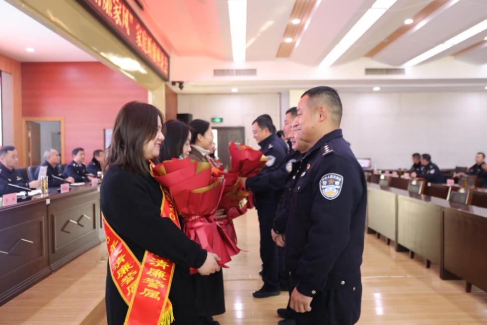 没有华丽的辞藻,唯有最真挚的表达。献花环节,平日里坚守岗位、不苟言笑的民警们,手捧鲜花走到家属面前,郑重地将花递到家人手中。不善言辞的他们,此刻眼里满是温柔,一句简单的“辛苦了,谢谢你”,道尽了藏在心底的感谢与牵挂。家属们接过鲜花,眼角漾起笑意,有的轻轻抚过花瓣,有的悄悄擦去眼角的湿润。这束鲜花,是对家属默默付出的最珍贵肯定——是她们操持家务、照顾老小,撑起了警营背后的“半边天”,让民警能安心奔赴工作岗位;这束鲜花,更是警营与家庭之间的温情纽带,牵起了理解与支持,让“舍小家为大家”的奉献,有了双向奔赴的温暖。