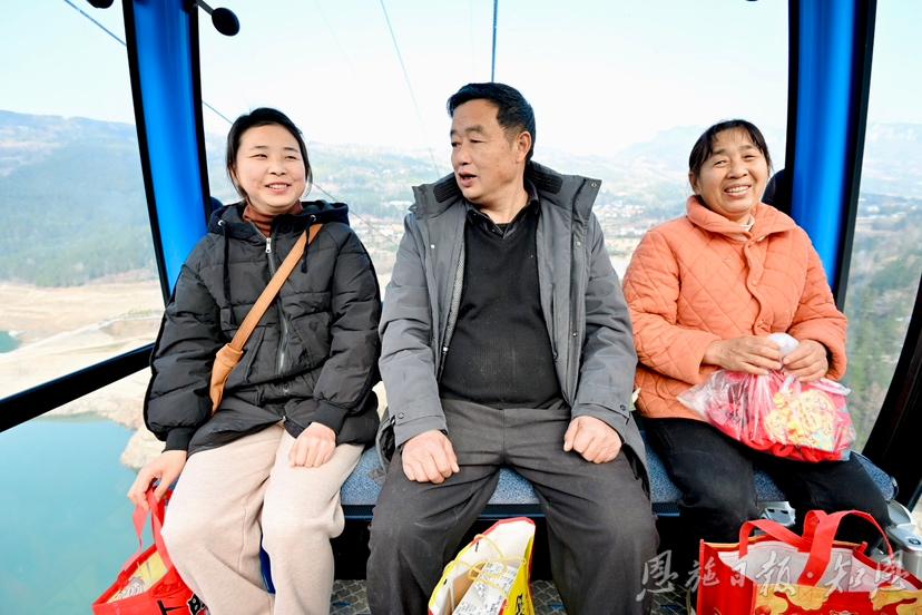 2月12日,天气晴好,在恩施大清江红花峰林景区跨江索道站,沙地乡柳池村村民提着年货有序登上缆车,搭乘“空中公交”前往新塘乡走亲访友。