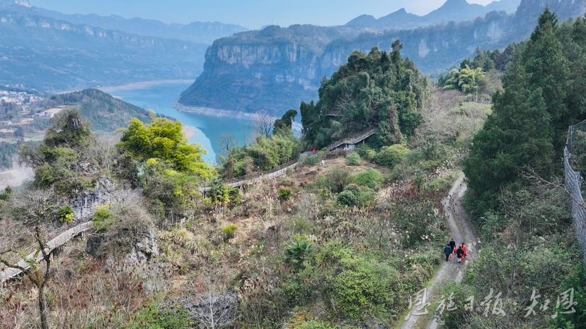 2月12日,恩施市沙地乡柳池村村民下缆车后走在前往新塘乡集镇的山路上。