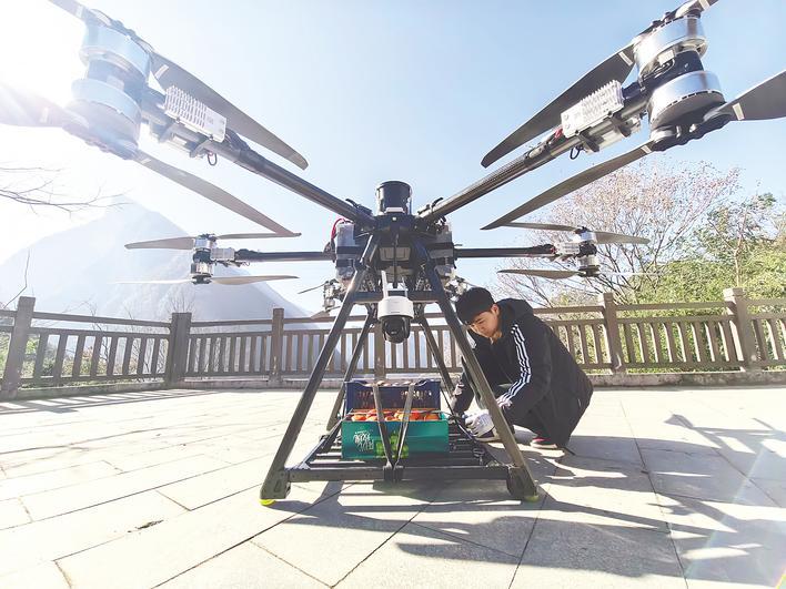 “现在山货出山特别快,取快递也更方便了。”在竹山县官渡镇桃源村,湖北云中翼航空科技有限公司操作员将鲜果稳稳固定在无人机货架上,无人机随即轻盈起飞,载着农产品飞向远方。