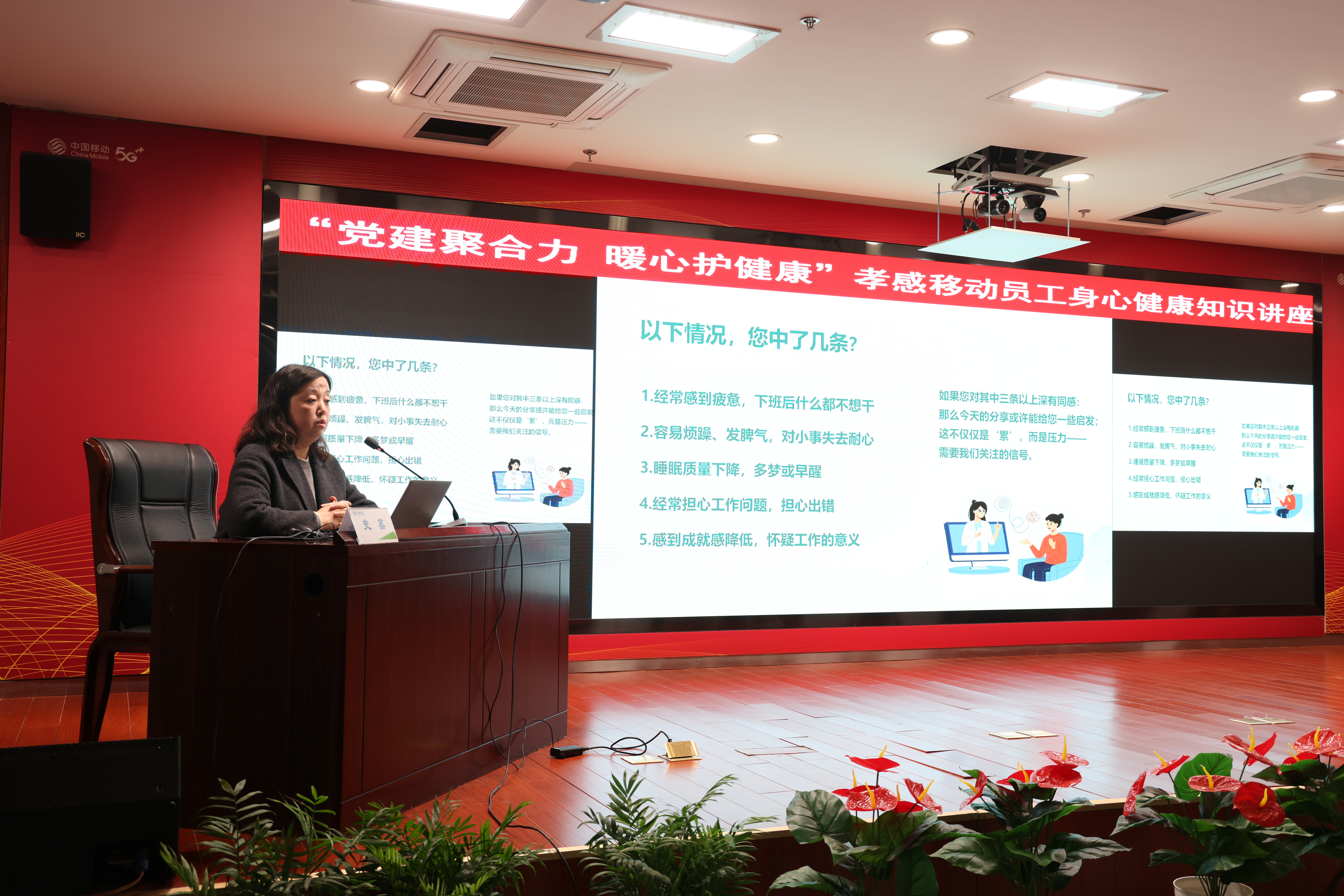 为深入践行“鄂争先孝为先”党建品牌精神与“暖心”员工关爱文化,切实提升员工的健康管理意识与心理调适能力,3月25日,孝感移动以“现场+视频”形式举办“党建聚合力·暖心护健康”身心健康知识讲座,公司党委书记、总经理作开课致辞,传递了公司对员工身心健康的深切关注,让全体员工在繁忙工作之余感受到组织的温暖关怀。