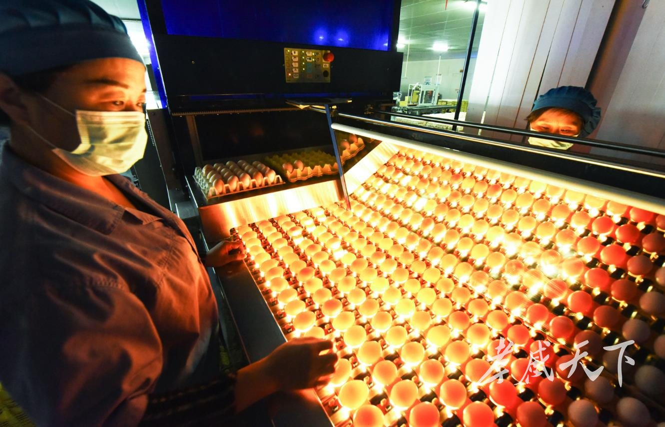 在安陆市神丹健康食品有限公司车间内,工人忙着对鸡蛋进行光照检测。全媒体记者李文勇 摄