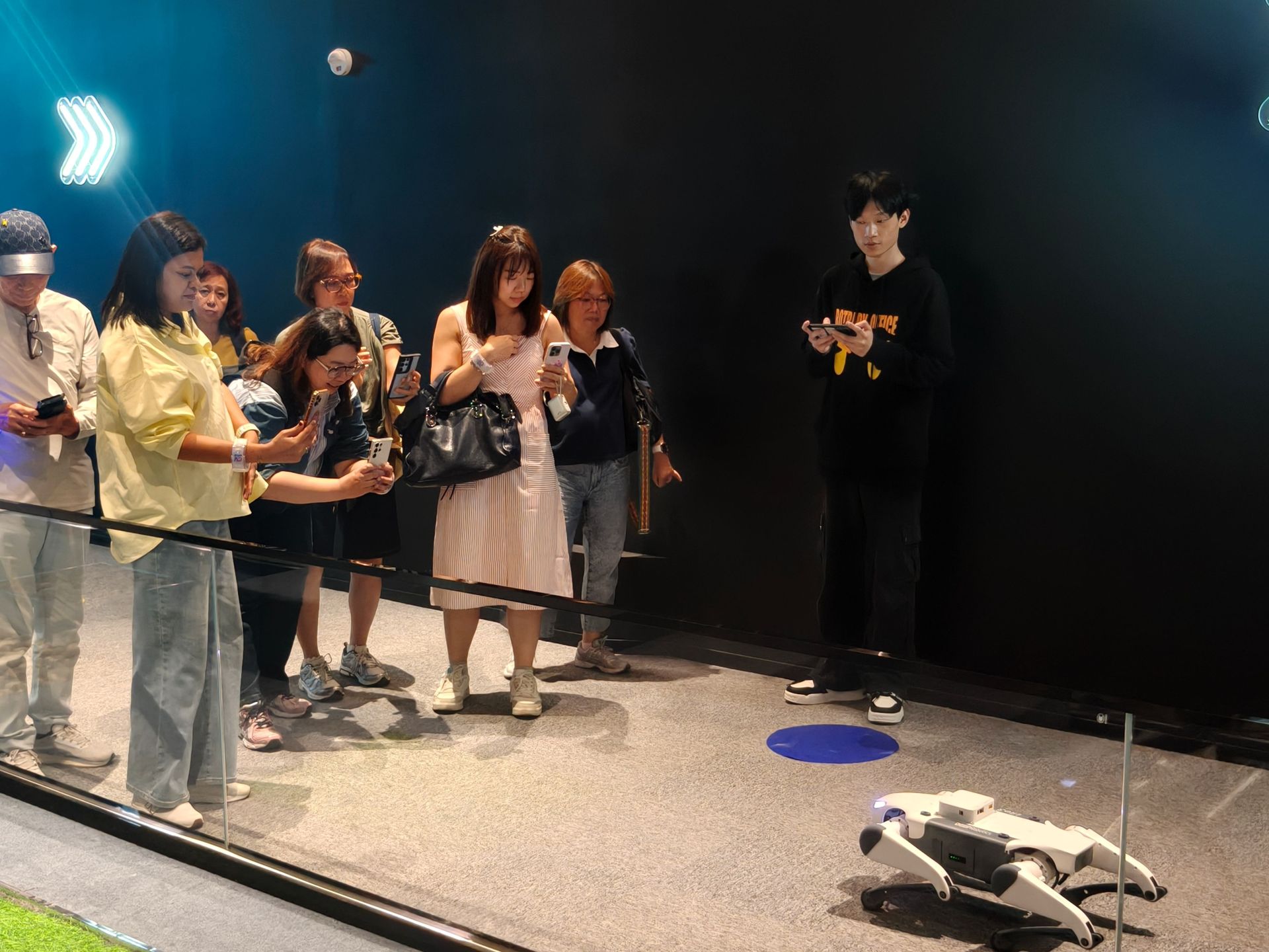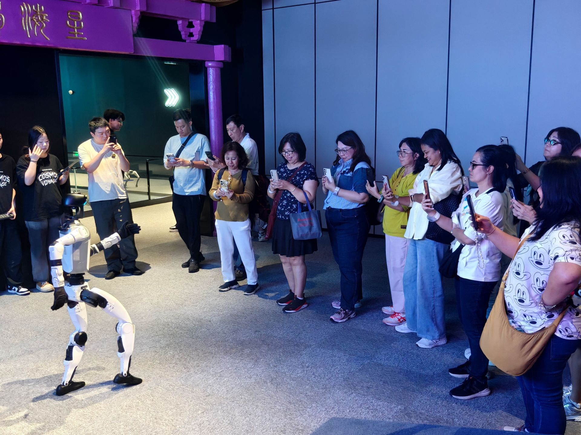 印尼游客们观看机器人跳舞。