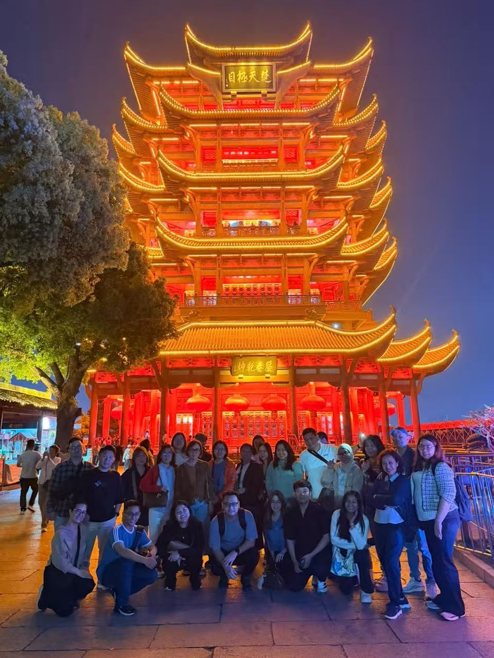 印尼游客打卡夜上黄鹤楼。旅行社供图