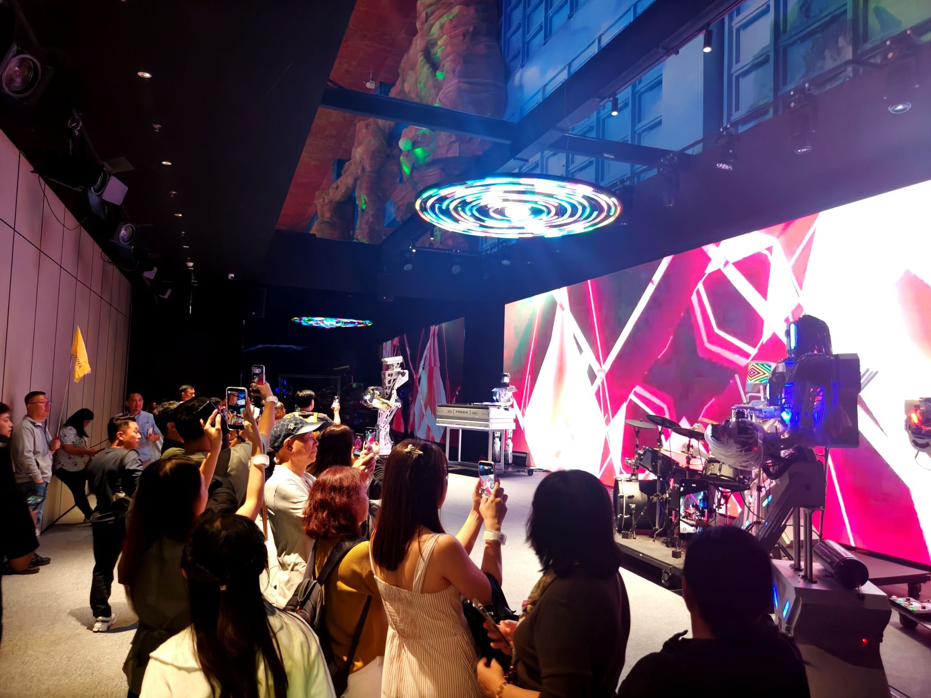 印尼游客们观看机器人乐队表演。
