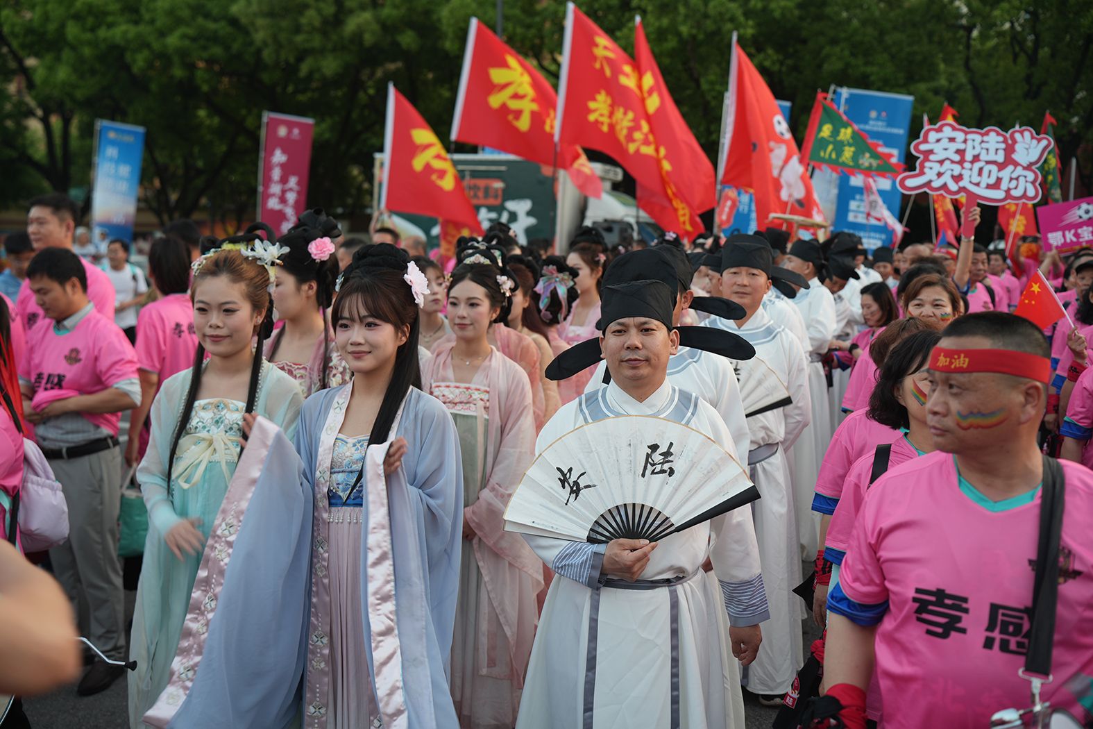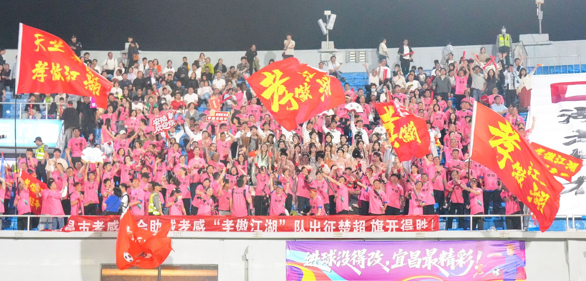 看台上,孝感300名球迷组成助威团,统一身着粉色T恤,自豪亮出胸前“孝感”名字,形成一片粉色花海。比赛现场,不仅两地球迷“较劲”,双方的拉拉队也擦出“竞赛火花”。孝感的“七仙女”“李白”拉拉队身着别具特色的传统服饰,给场上队员加油鼓劲,成为一道靓丽的风景。湖北工程学院老师黄洲说:“我很荣幸带领仙女拉拉队亮相‘楚超’宜昌赛场,队伍主要由音乐学院学生组成,有32名‘仙女’、1名‘董永’、3名带队老师。”据介绍,该学院高度重视孝感队比赛,组织“湖工文艺轻骑兵”志愿服务队参加,历时一个多月,从活动策划、人员选拔、节目编排、服装造型设计、彩排打磨等全流程精心筹备,充分融入了孝感元素。“以球会友+美食传情”孝感文化闪耀长江之滨“楚超”既是体育赛事,也是文化盛事。此次孝感“七仙女”和安陆“李白”除了赛场助阵,还在宜昌甜蜜“撒糖”,引来阵阵喝彩。