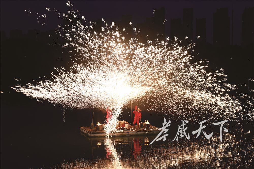 游客王先生举着手机不停拍摄:“第一次看水上打铁花,比电视上壮观太多了!漫天星火特别震撼,孝南的夜生活越来越有味道了。”