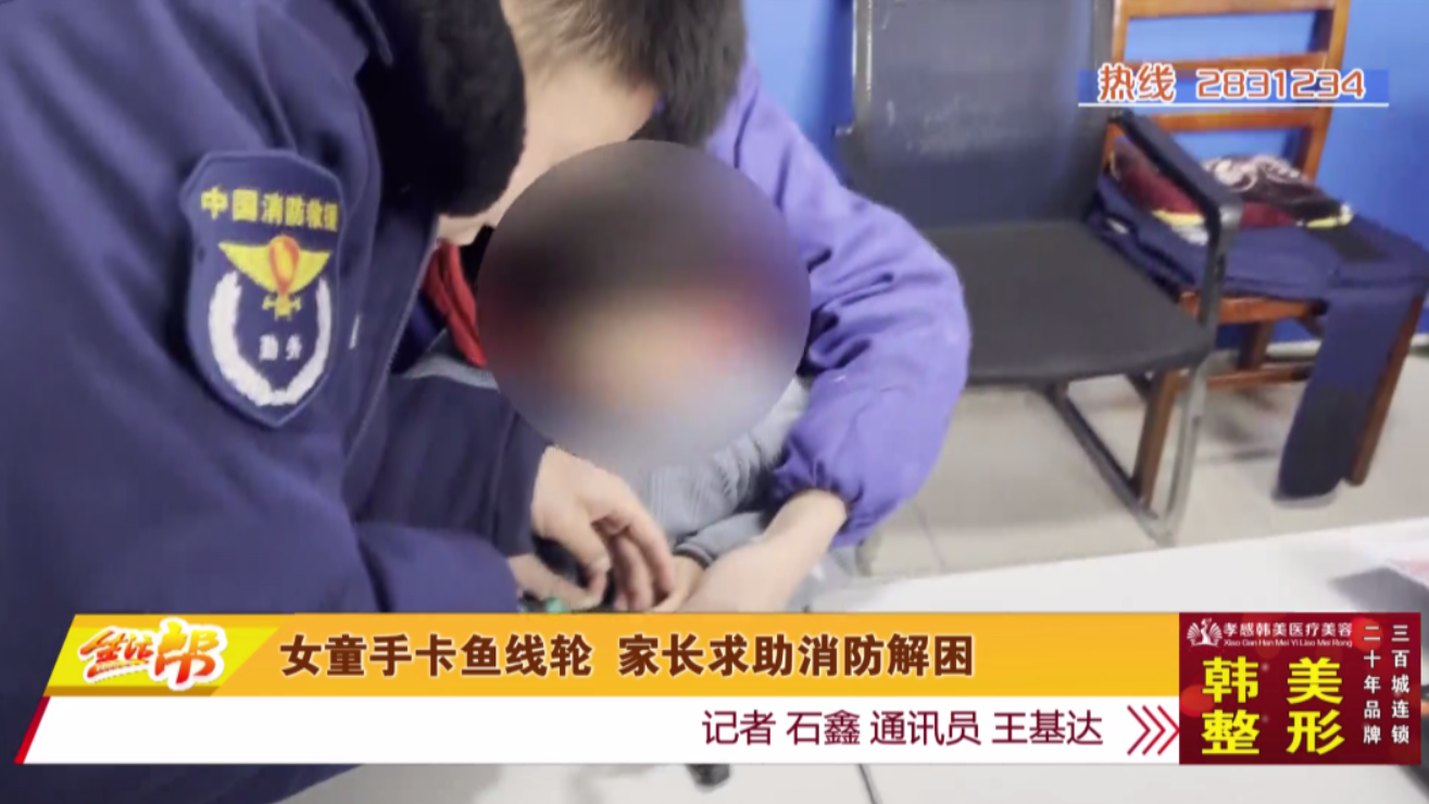 2月17日下午4点40分,一群家长带着一名四岁的女童急匆匆地赶到孝昌县建设路消防救援站求助,称孩子在家里玩钓鱼竿时,不慎把左手中指卡在鱼线轮里,只得求助消防员。