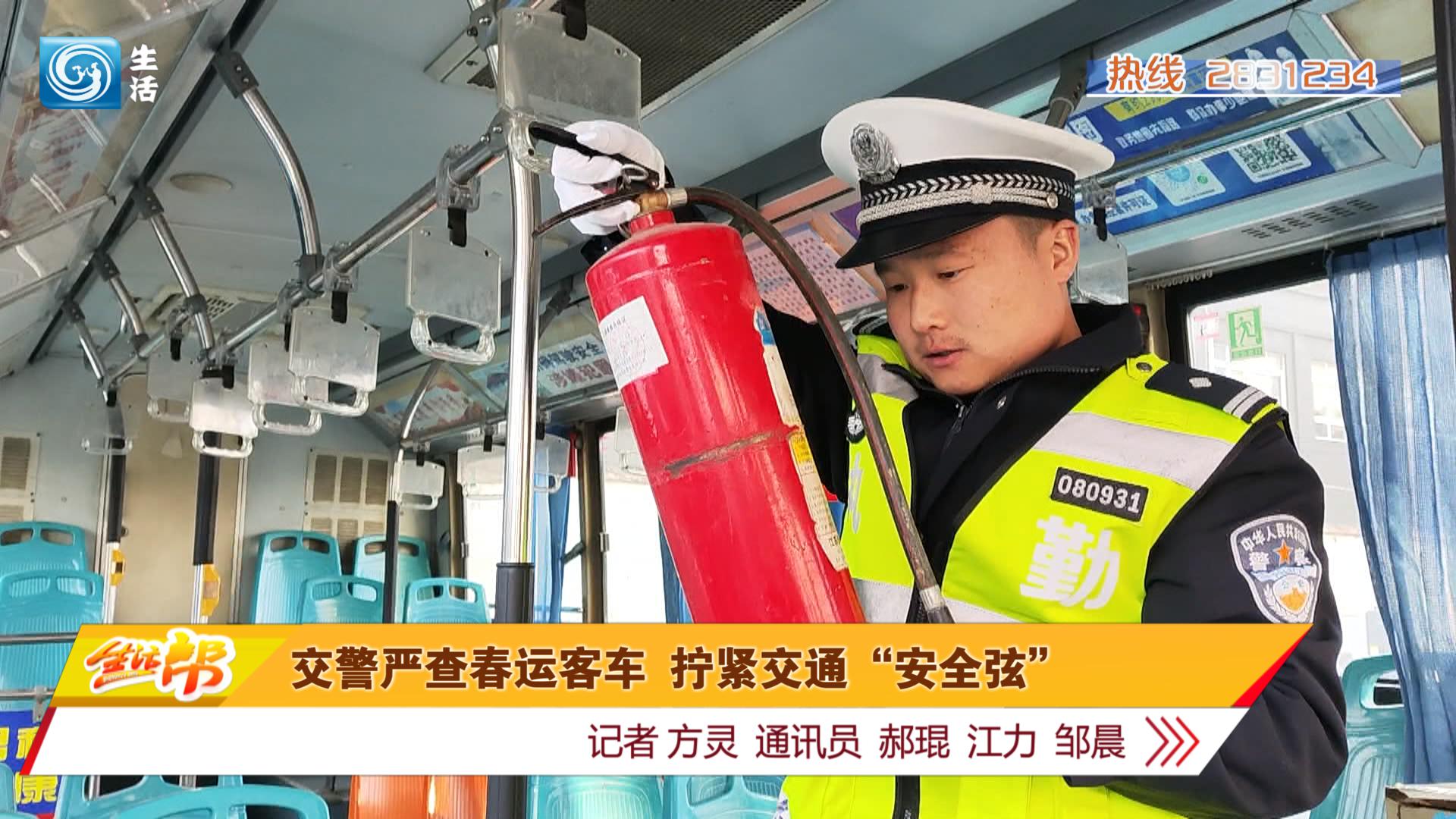 2月25日下午3点,市公安局交通管理局直属一大队北京路中队的民辅警,在北京路春运安全检查点,对过往的每辆客车进行全面排查,对车辆的营运证件、安全消防器材、安全锤、轮胎磨损状态及客车是否超员超载等情况进行认真检查。